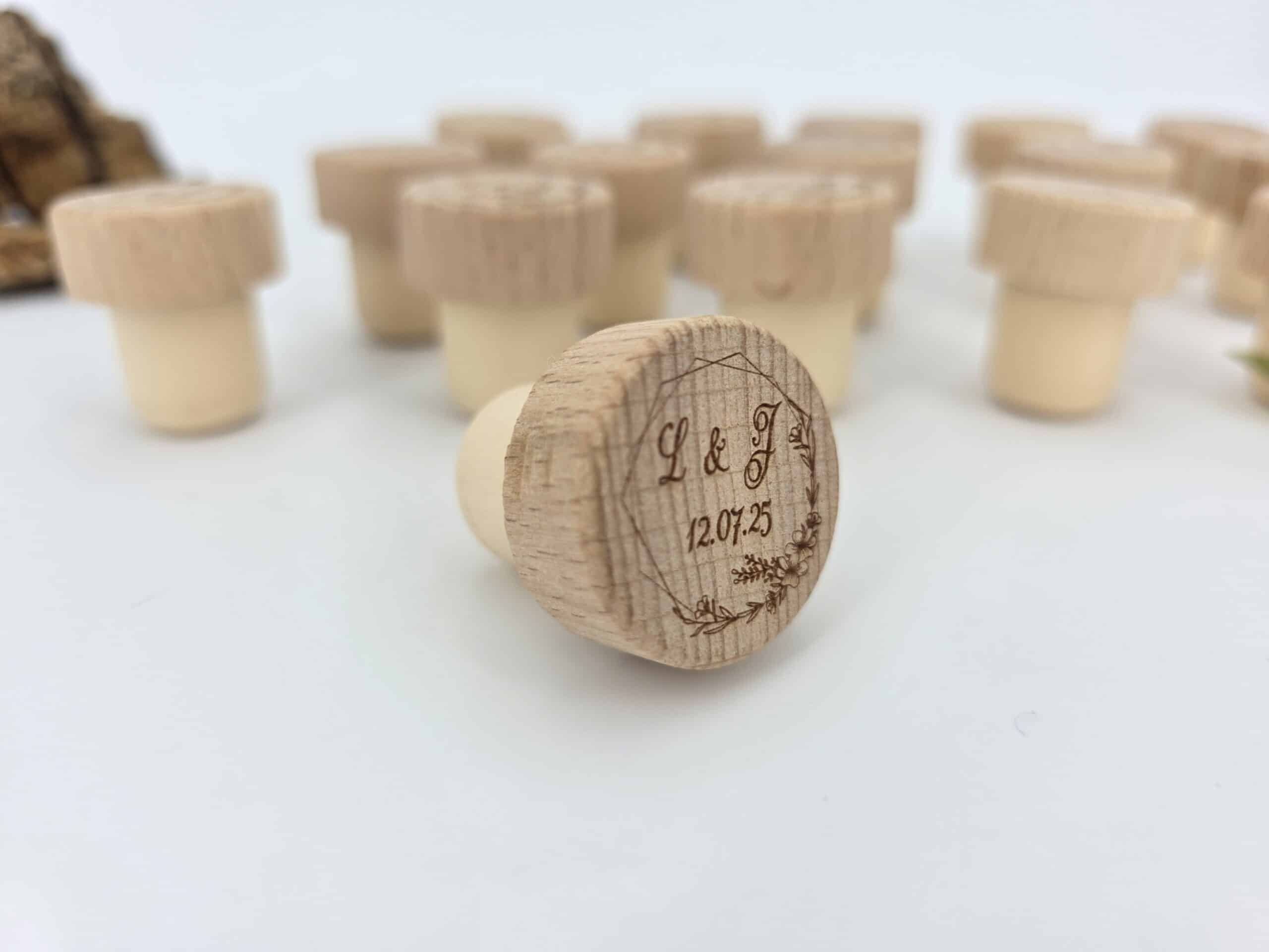 Offrez à vos invités un présent original et raffiné avec nos bouchons en bois personnalisés. Alliant authenticité et utilité, ils deviennent un cadeau unique qui prolonge la mémoire de votre événement à chaque utilisation.