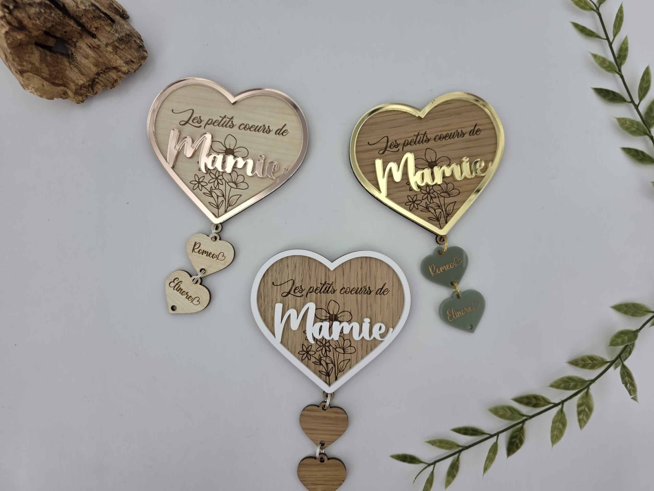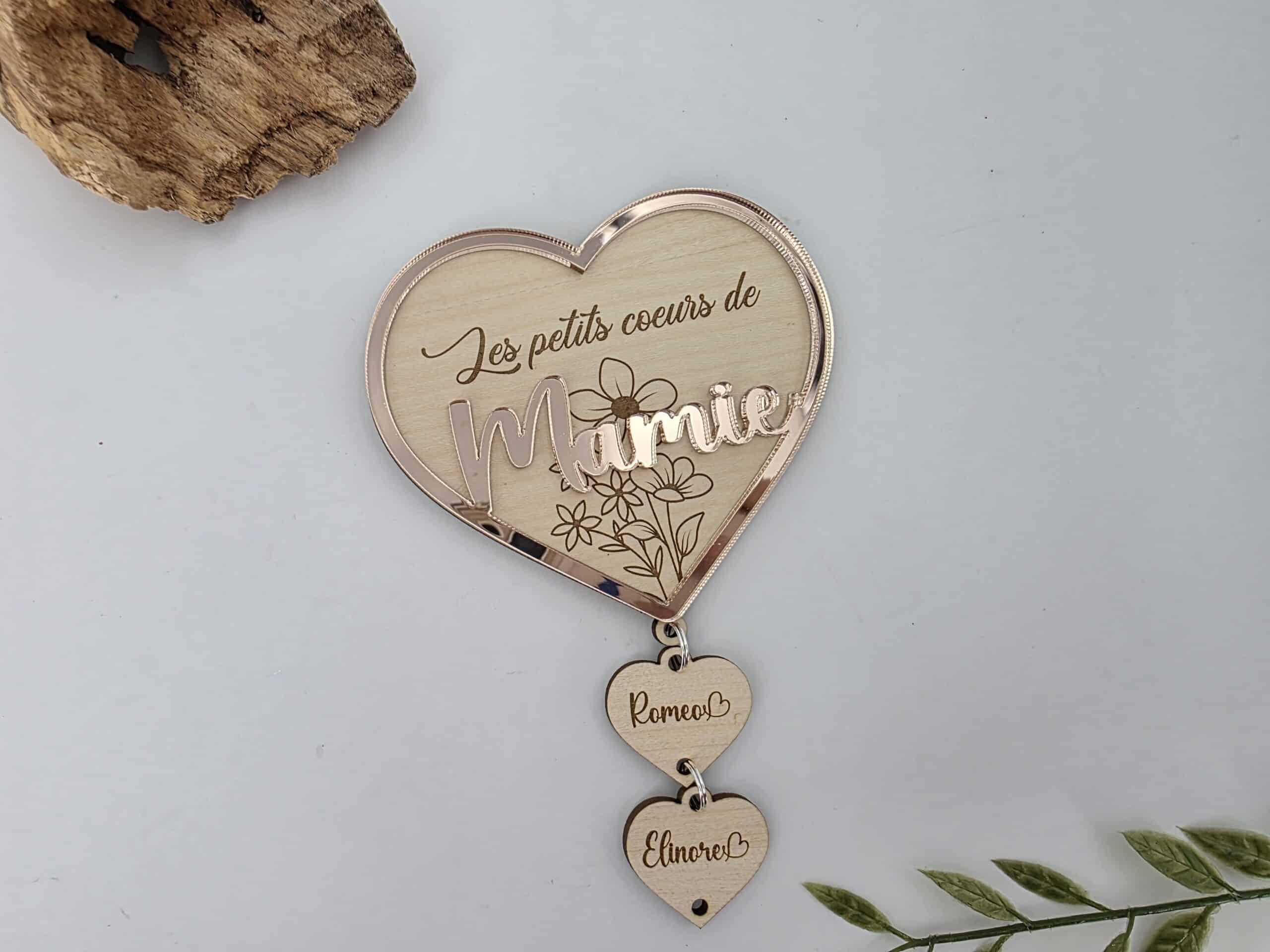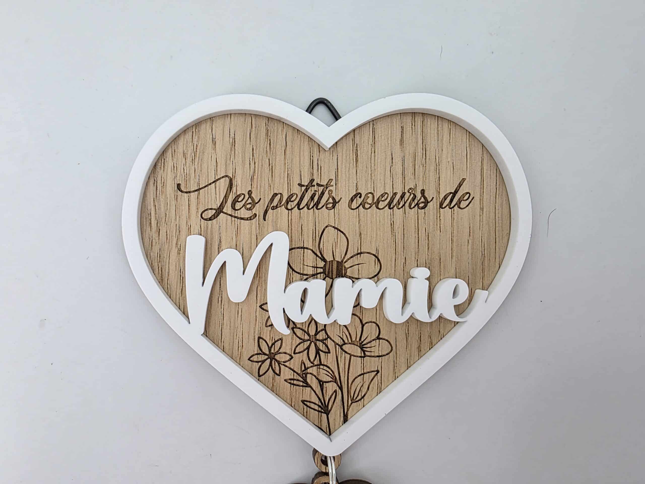 Ce cœur en bois finement gravé est sublimé par un décor en 3D délicatement posé en relief, apportant élégance et douceur à l’ensemble. Son message central est accompagné de pendentifs en forme de petits cœurs, chacun personnalisé avec le prénom des petits-enfants.
