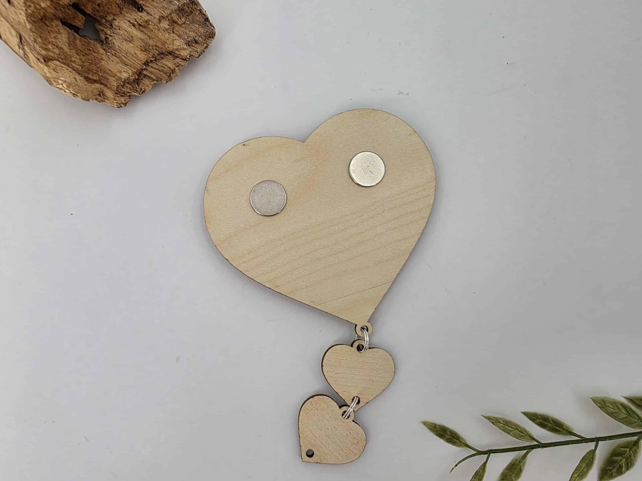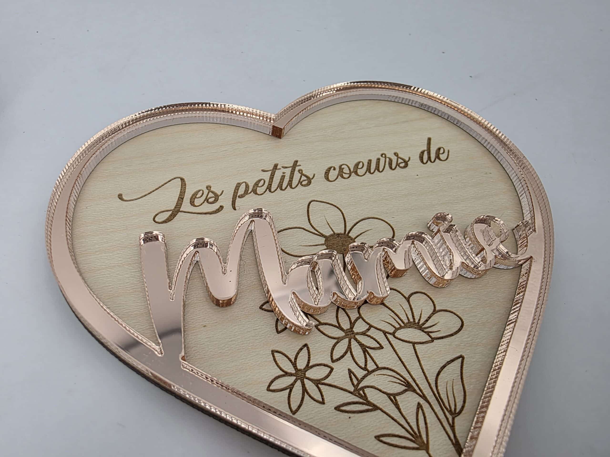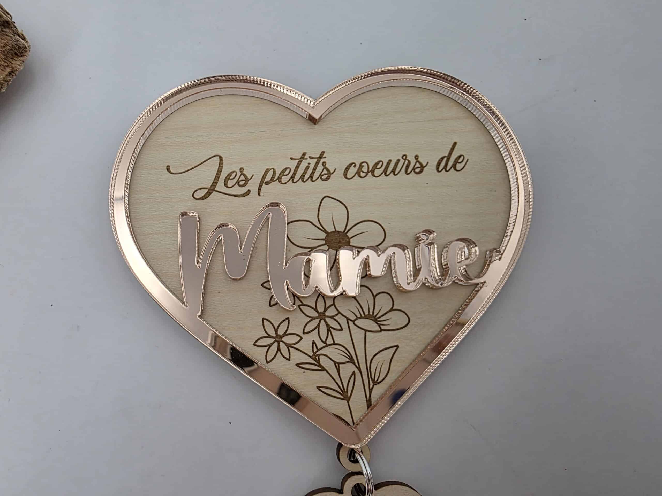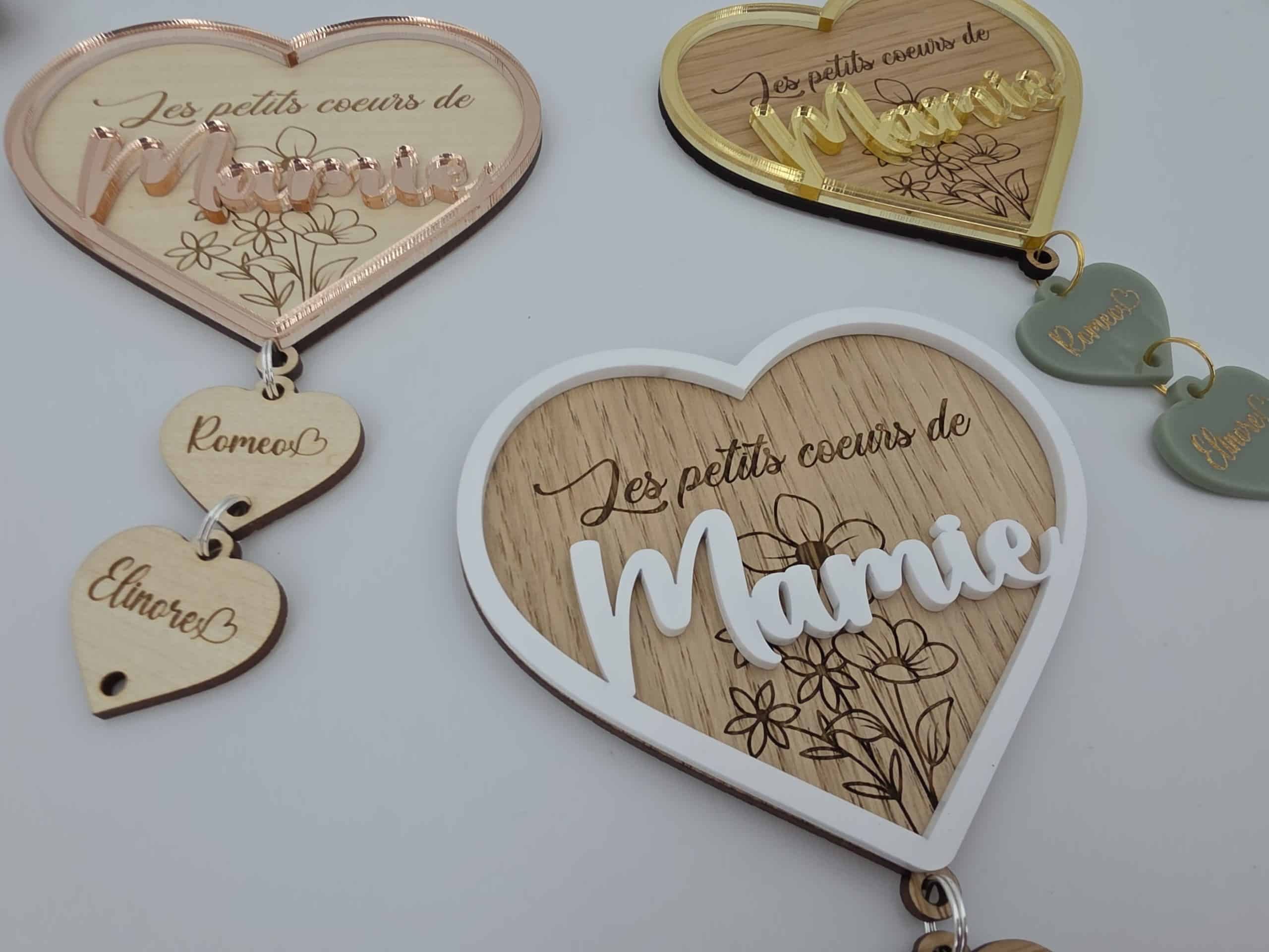 Ce cœur en bois finement gravé est sublimé par un décor en 3D délicatement posé en relief, apportant élégance et douceur à l’ensemble. Son message central est accompagné de pendentifs en forme de petits cœurs, chacun personnalisé avec le prénom des petits-enfants.