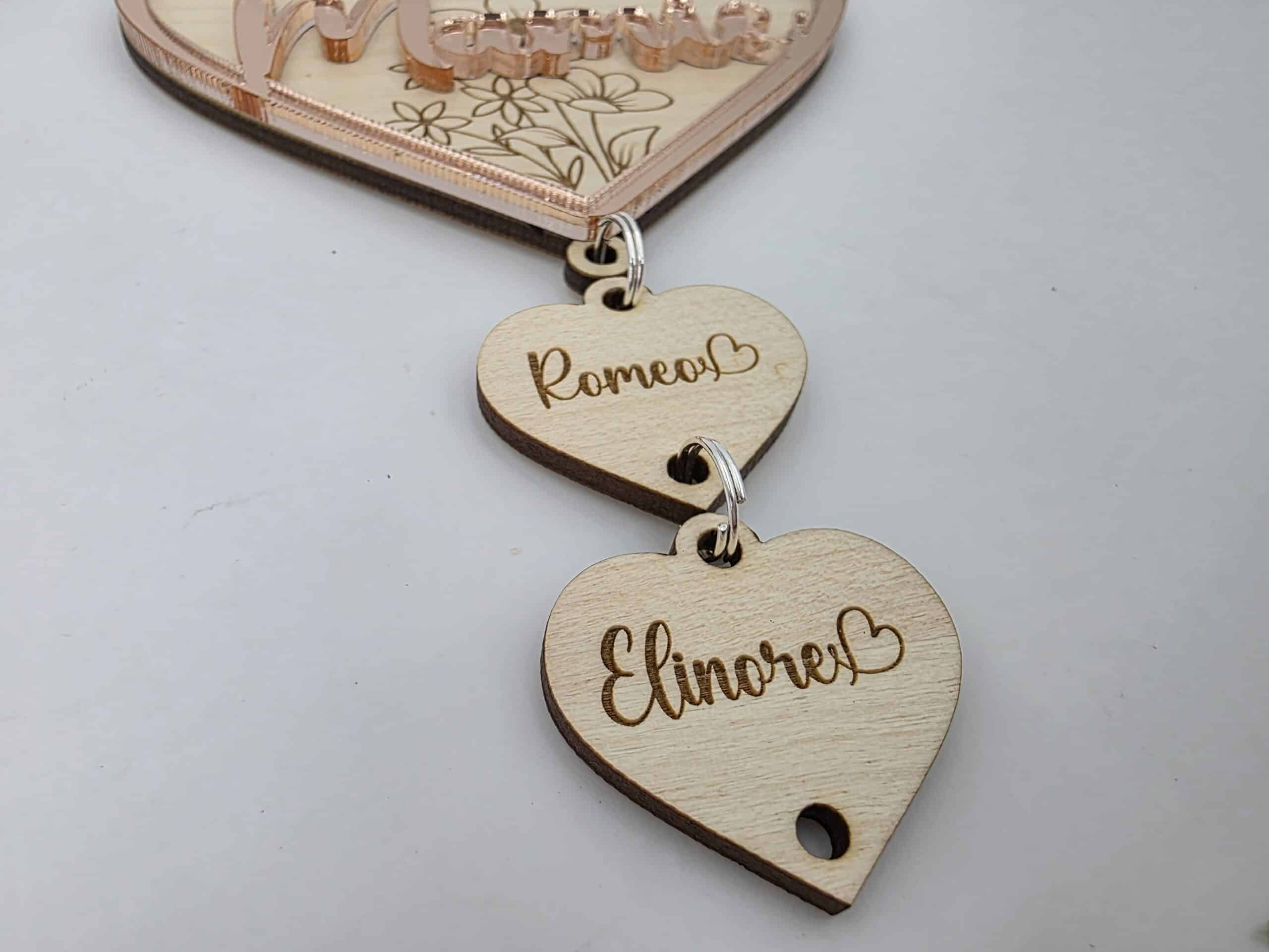 Chaque prénom devient ainsi un symbole précieux, suspendu sous le cœur principal comme autant de marques d’amour.